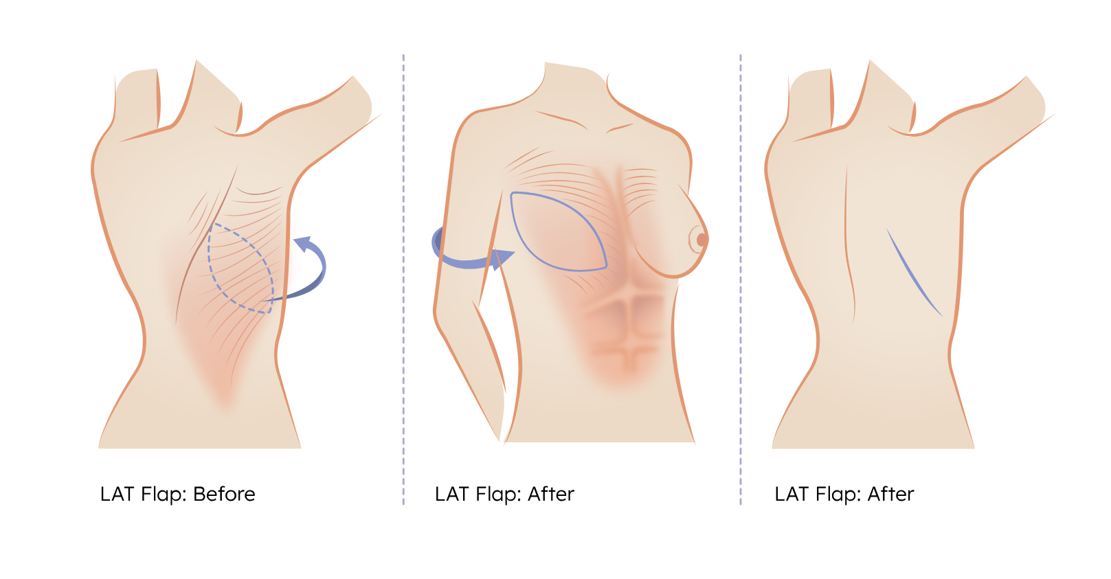 The Latissimus Dorsi Flap is a type of breast reconstruction that uses muscle, skin, and fat from the upper back to help rebuild the breast after mastectomy or failed reconstruction. This tissue is tunneled under the skin to the chest to create a new breast shape, often combined with an implant for added volume.